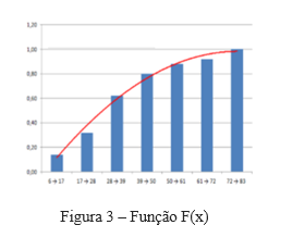 Ao dividir o número de falhas ocorridas em cada classe pelo total de amostra, temos a frequência relativa simples de cada classe, ao dispô-la de forma acumulativa da classe 1 a 7, obtemos a figura 3, que representa a “probabilidade de falha”, a famosa F(x).