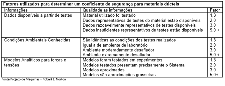 O quadro abaixo é uma informação do livro projeto de maquinas de Robert L Norton que sugere um critério para estabelecer coeficientes de segurança para matérias dúcteis.