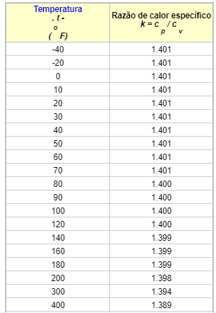 k = Tx de calor específico = 1,4 ( Ver tabela 1)