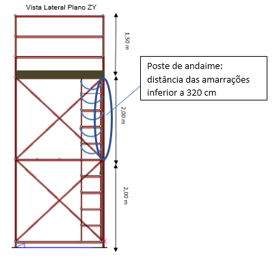 Quando uma barra de andaime é colocada na vertical, do ponto de vista estrutural ela se tornou um pilar, conhecido em campo como “poste”. Nas configurações de andaimes mais comuns, os pilares de andaimes normalmente apresentam boas capacidades de cargas em suas configurações. O maior erro encontrado no uso de postes, é uma restrição de comprimento, pela NBR 8800 ( que é a norma adequada para projetos de estrutura metálica), uma barra de andaime, com geometrias apresentadas ( 48 mm x 3 mm ) apresentadas a cima, não pode ter comprimento superior a 320 cm, as distancias entre as amarrações deve ser inferior a 320 cm. Havendo esse risco, a mesma pode flambar, provocando o colapso da estrutura. Uma barra de andaime funcionando como pilar na vertical resiste em torno de 1500 kgf para L<320 cm (confirmar esse valor é responsabilidade do fabricante dos andaimes).