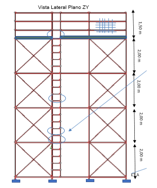 Ao aplicar a mesma força, percebe-se a estrutura rígida e estável. As ligações dos andaimes são feitas normalmente com abraçadeiras giratórias que possuem “alguma” rigidez, mas de maneira alguma fazem que sejam dispensadas as diagonais. O número de diagonais, e os planos em que elas devem constar é responsabilidade do projetista. Ausência de contraventamentos(diagonais) é risco de colapso. Os andaimes devem possuir contraventamentos em todos os seus planos ( ou seja vista superior, vista frontal e vista lateral). A alternância de contraventamentos por torre da estrutura é responsabilidade do projetista. Há andaimes em que o fabricante garante rigidez nas ligações, porém, essa rigidez pode funcionar para configurações pequenas, porém, para grandes andaimes de maneira alguma essas ligações farão o papel da diagonal, dos contraventamentos, ficando mais um cuidado para a prática equivocada que infelizmente acontece e deixa um risco de colapso na estrutura.