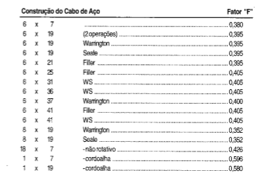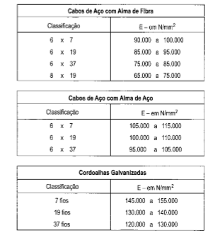 O módulo de elasticidade do cabo de aço e o fator de área devem ser fornecidos pelo fabricante do cabo, no entanto, pode-se estimar: