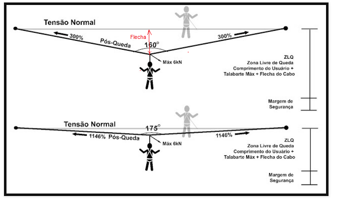 O projetista sempre prevê uma catenária na linha de vida, ou melhor, uma flecha para que as tensões no cabo e nas ancoragens fiquem dentro dos limites das tensões admissíveis considerando os fatores de segurança previstos nas normas