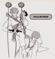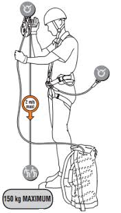 O utilizado para atividade de resgate em altura deve ter uma resistência que suporte duas pessoas ao mesmo tempo deve possuir as seguintes certificações: EN 341 classe A, CE EN 12841 tipo C, NFPA 1983 General Use ANSI Z359.4 (2013), EAC. O mesmo deve possuir as seguintes funções: anti-pânico e auto blocante, o que seria estas duas funções.
