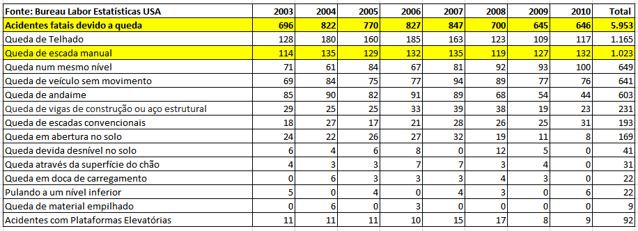 Olhando os dados referente aos acidentes fatais nos Estados Unidos da América, vemos que o número de fatalidades pelo uso de “Escada Manual” é a segunda maior causa de acidente, quando consideramos o grupo “Acidentes Fatais Devido a Quedas”. Número inesperadamente alto diante da tecnologia existente e disponível no mercado.