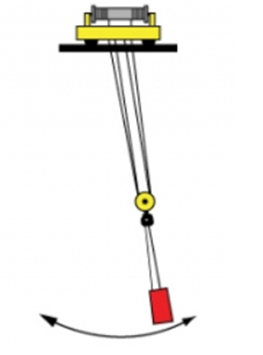 Quando o carrinho da ponte rolante está se deslocando com uma velocidade “v” e em um determinado momento o deslocamento do carrinho é interrompido porque precisamos parar o deslocamento da ponte, ocorre neste instante um momento de frenagem. A carga dependurada pelo cabo tende a continuar o deslocamento provocando neste instante um movimento pendular da carga.