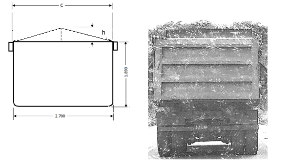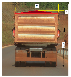Coroamento da Carga por elevar o centro de gravidade deve também ser considerado e pode ser calculado pela seção de material acima do limite lateral da caçamba conforme desenho abaixo: