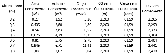Na tabela abaixo calculamos a mudança do centro de gravidade para as diversas alturas de carregamento.